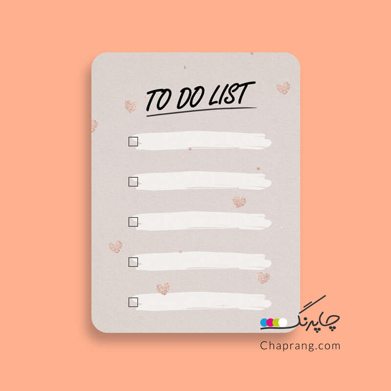 طرح این مگنت ساده با زمینه طوسی، قلبهای ریز در زمینه و کادرهای سفید برای نوشتن متن کارهای روزانه است. در بالای مگنت هم متن TO DO LIST درج شده است.