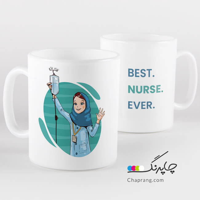 لیوان با طرح بهترین پرستار دنیا با یک کاراکتر پرستار و سرم و در طرف دیگر متن Best Nurse Ever که طرحی مناسبتی و ویژه برای قدردانی از پرستاران خانم است.